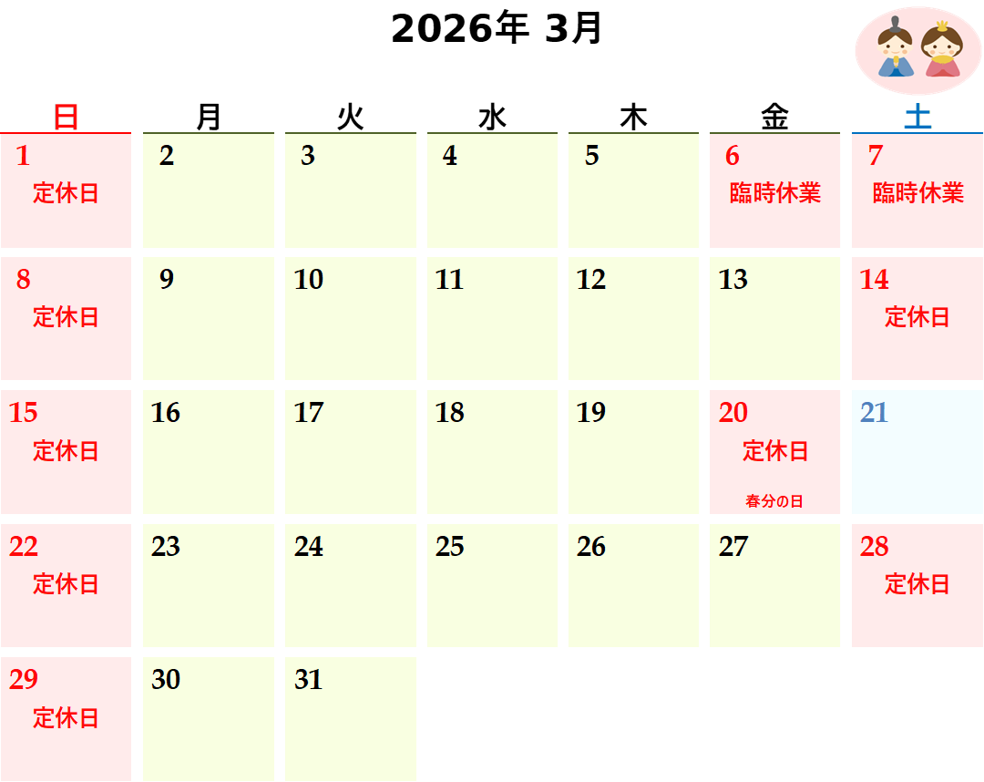 誠に勝手ながら、3月6日(金)・3月7日(土) は臨時休業とさせていただきます。