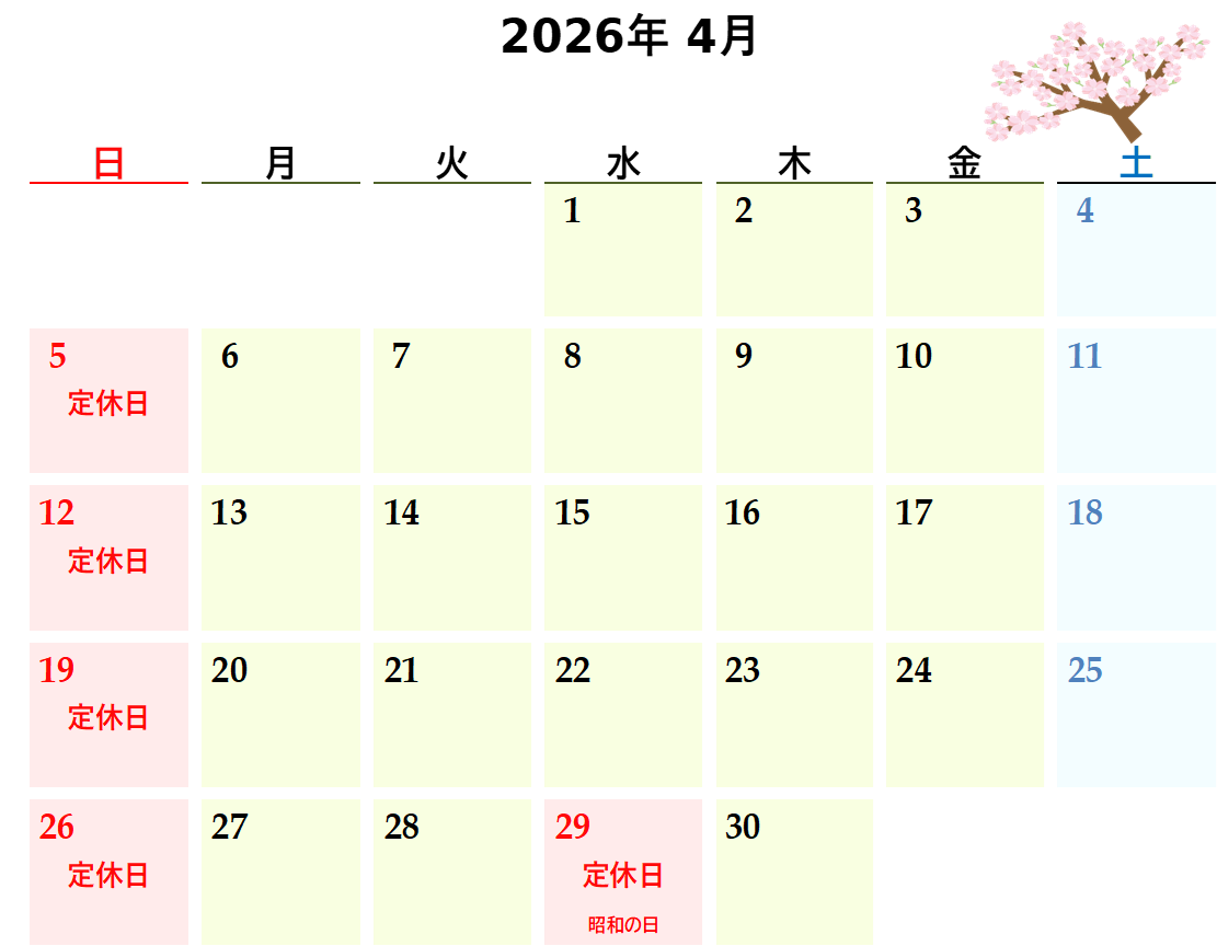 4月 営業日のお知らせ ☆ 毎週 土曜日 営業